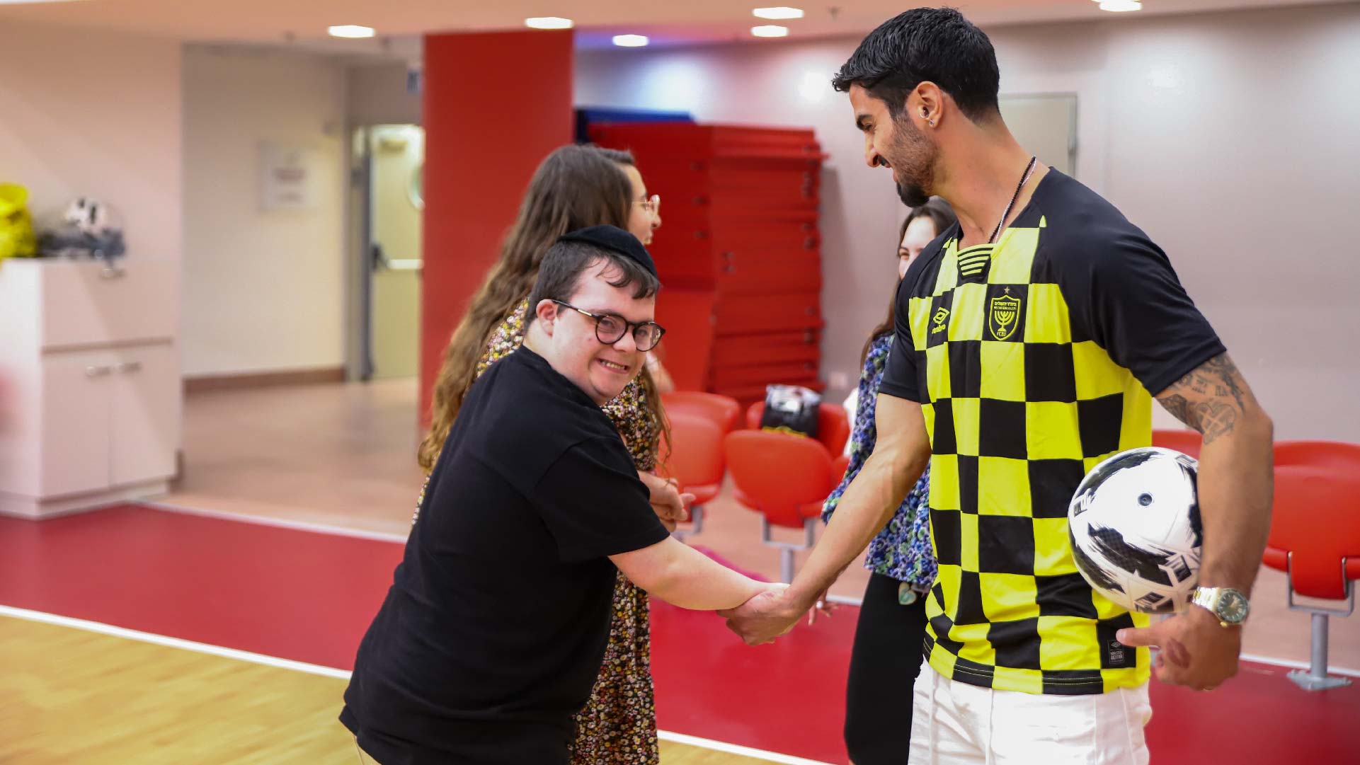 הילדים הנהדרים של המרכז מתאמנים על בסיס שבועי, מתחזקים, נהנים, וזוכים ללמוד כדורגל ממאמנים המחלקה המצוינים. למרות הקשיים שהציבה הקורונה בפני כולם, המשיכה העבודה המאומצת בקבוצה והיום (ובהפתעה מוחלטת לילדי הקבוצה) גם הגיע אורח מיוחד לאימון הרגיל – אופיר קריאף שבילה עם הילדים, שיחק איתם המון כדורגל ובעיקר העלה אינספור חיוכים לשחקנים ולכל מי שמלווה אותם.